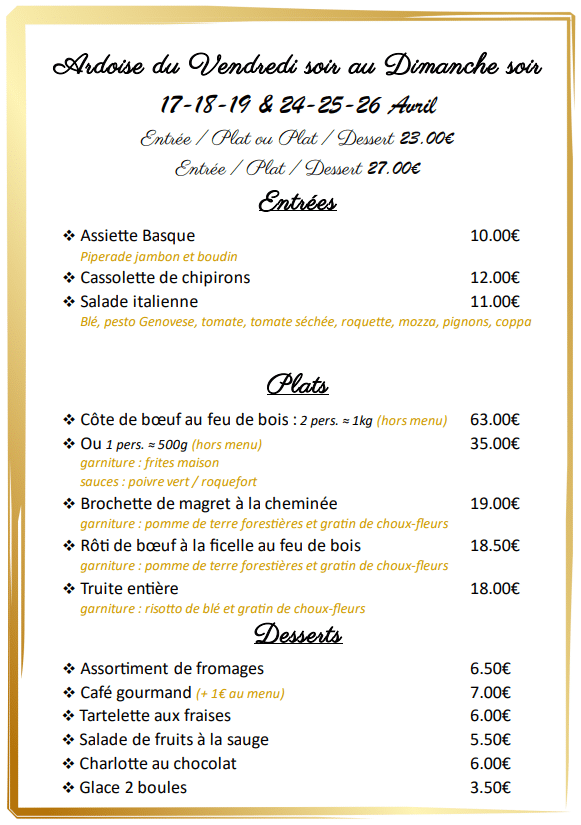 Au cœur de Tardets-Sorholus, découvrez un sanctuaire gastronomique où la tradition rencontre l’innovation. Le restaurant La Cheminée à Tardets vous propose une cuisine traditionnelle exquise, préparée avec des produits frais et cuits au feu de bois.
